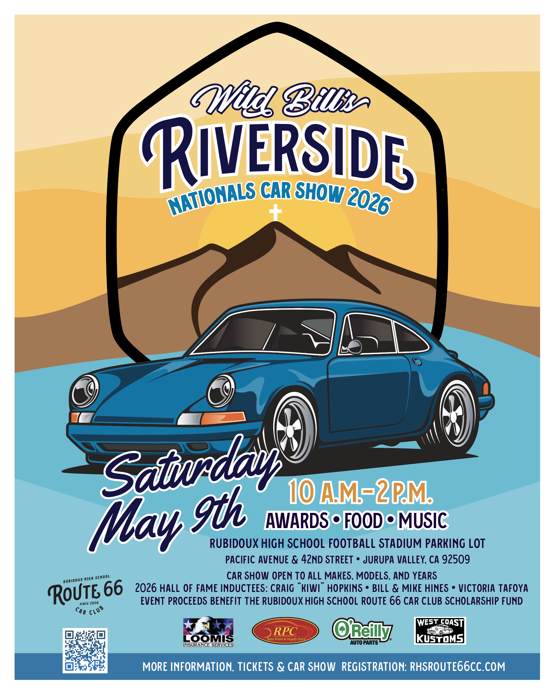Riverside Nationals Car Show registration open to all years, makes and models. Proceeds benefit the Rubidoux High School Route 66 Car Club Scholarship Fund.